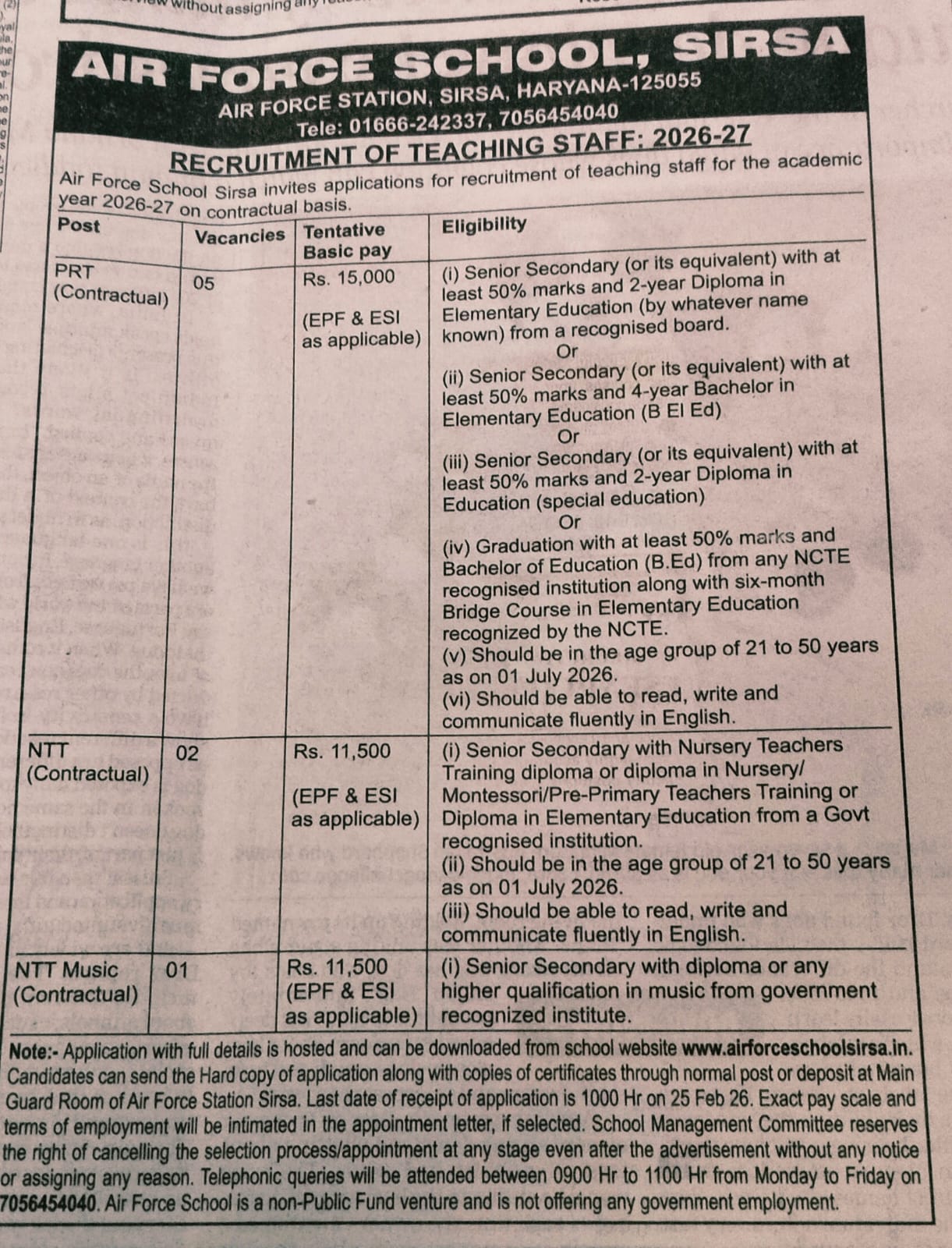 Air Force School, Sirsa started functioning from July 1977. It catered for classes Nursery to VII till 1982.In October 1982, Classes I to VII were taken over by the KVS with the opening of a KV in the campus. With effect from 1985, the Air Force School was left with only Pre-Primary after the up gradation of the KV......